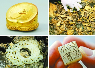▲拼版照片,左上圖為:海昏侯墓出土的馬蹄金(2015年11月24日攝);右上圖為:海昏侯墓主棺出土的金餅、馬蹄金、麟趾金和金板(2015年12月24日攝);左下圖為:海昏侯墓出土的龍虎形玉佩(2015年11月18日攝);右下圖為:海昏侯墓出土的刻有“大劉記印”字樣的龜形玉印(2015年12月13日攝)。