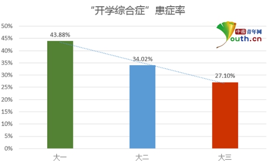 圖為從大一至大三“開學綜合癥”患癥率柱狀圖。中國青年網記者 王龍龍 制圖