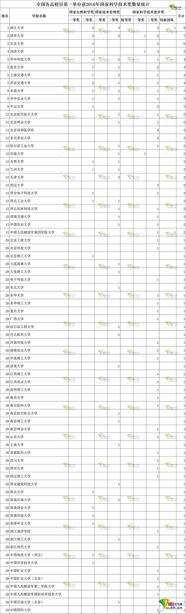 據(jù)中國青年網(wǎng)統(tǒng)計,133所獲獎高校中有75所高校作為第一完成單位獲獎,其中,浙江大學(xué)有9個獎項,位居第一;清華大學(xué)(7個)和北京大學(xué)(6個)分列第二位和第三位;同濟(jì)大學(xué)(5個)、華中科技大學(xué)(4個)、南京大學(xué)(4個)、上海交通大學(xué)(4個)、西安交通大學(xué)(4個)、東南大學(xué)(3個)、華中農(nóng)業(yè)大學(xué)(3個)、中山大學(xué)(3個)等8所高校也進(jìn)入前十名。