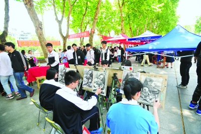 昨日在市十一中的中招咨詢會上,有的學校安排學生現場作畫展示教學水平 記者彭年 攝