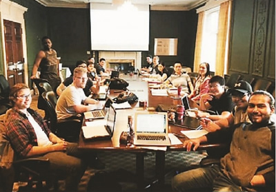 熊駿(右三)與自己參加的經數社團的朋友們為期末復習考試做準備。