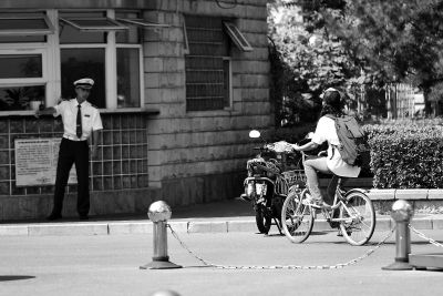 昨天中午12時(shí)許,記者推著一輛摩拜單車來(lái)到北京理工大學(xué)中關(guān)村校區(qū)東門,保安攔下,“這車不讓進(jìn)!”