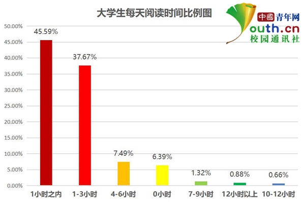 根據中國青年網記者調查顯示,每天閱讀時間在1小時之內的學生占45.59%,其次為1-3小時、4-6小時,分別占37.67%和7.49%。還有6.39%的大學生每天閱讀時間為0。由此可以看出,51.98%的學生每天閱讀時長不超過1小時。