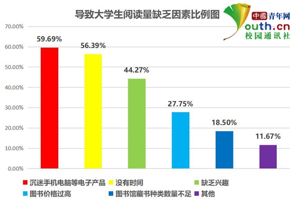 目前,許多大學生表示閱讀情況不容樂觀,那么,是什么因素會導致閱讀量缺乏呢?根據中國青年網記者調查顯示,59.69%的學生認為是“沉迷手機電腦等電子產品”,其次“沒有時間”閱讀和“缺乏興趣”,各占56.39%、44.27%。此外,還有18.5%的學生認為“圖書館藏書種類數量不足”導致閱讀量缺乏。
