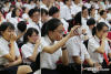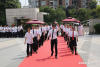 •   學生在老師帶領下走紅毯。   7月3日下午,西安一中學舉行初中畢業(yè)典禮,學生們走紅毯,聽老師講最后一節(jié)課,在操場航拍畢業(yè)照。   就要分開了,學生老師依依不舍,不少學生哭成了淚人兒。(記者 魏永賢)
