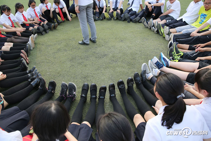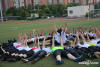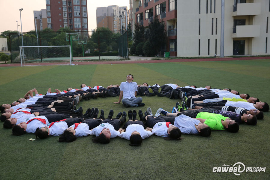 •   學生們躺在操場的草坪上,把老師圍在中間。