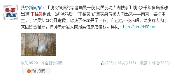當(dāng)我們回過頭來再思考一下整個(gè)事件,對于丁錦昊而言,無疑他犯了錯(cuò)誤,他讓有3500年歷史的盧克索神廟在哭泣了,在丁錦昊與它那場跨越千年的對話中它蒙羞了,它已走過了三千多年的漫長歲月,在公元2013年卻被刻上了永不可抹去的傷痕。但之后網(wǎng)友的人肉搜索和口誅筆伐對于一個(gè)13歲的孩子是否過于殘忍了?