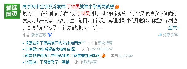 在5月24日丁錦昊“到此一游”事件曝光后,輿論引起軒然大波。至5月25日晚11點(diǎn),評論已達(dá)11000多條,轉(zhuǎn)發(fā)達(dá)到83000多條,網(wǎng)上的相關(guān)評論則達(dá)數(shù)十萬條,而主題詞就是中國游客的“素質(zhì)”。在譴責(zé)這種不文明行為的同時(shí),也有網(wǎng)友“人肉”出,丁錦昊是南京某中學(xué)在讀的初一學(xué)生等個(gè)人信息。而網(wǎng)友對于丁錦輝的聲討更是一浪高過一浪。 5月25日,丁錦昊的父母主動(dòng)站出來發(fā)聲,在為孩子的行為道歉的同時(shí),也懇請得到改正的機(jī)會(huì),并透露,題字風(fēng)波發(fā)酵后,孩子哭了一整夜。至此,丁錦昊“到此一游”事件算是暫時(shí)告一段亂。