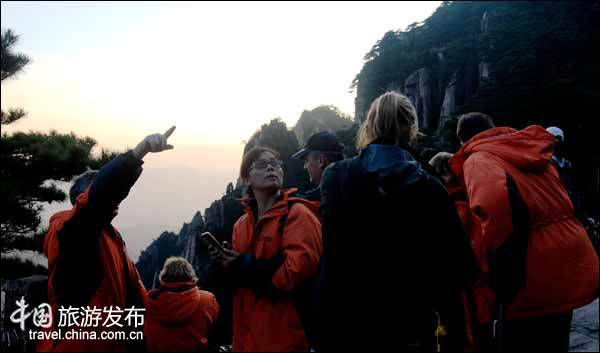 每年黃山吸引了大批外國游客前來旅游觀光。8月28日,8位澳大利亞游客在黃山風景區排云亭處觀賞美景,不停拍照,同伴之間還不時將在黃山拍出來的美景進行分享。(王輝 文/圖)