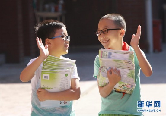 8月31日,在江蘇省無錫市揚名中心小學,兩名同學在領取新學期教材。新學期,每個學生感受都不同,有初來乍到的新奇,有早起上課的困倦,有與小伙伴重逢的喜悅,也有與家人短暫離別的不舍……開學的表情,豐富多彩。新華社發(湯毅攝)
