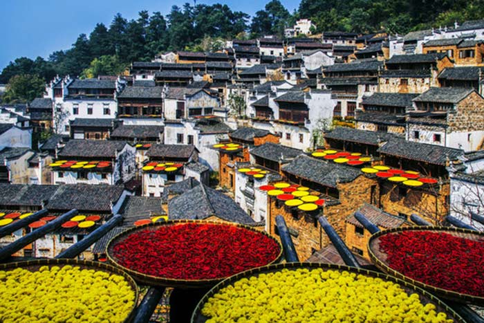 在九月收獲之后,當(dāng)?shù)囟剂餍邪咽斋@的果實(shí)放在自家屋脊上裸曬。此景與古徽州的黑白建筑,田園風(fēng)光相映成趣,獨(dú)特魅力而又壯觀。
