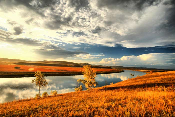 如果說夏末初秋的呼倫貝爾是乍黃還綠,有一種無言的詩意美,那么深秋的呼倫貝爾,就是一種一望無際的恢宏之美。當(dāng)草原就慢慢褪去青翠,燥熱也漸漸消散,換上的是綠中帶黃,黃中夾雜著紅的奇妙景色,就像上帝打翻了顏料盤,五彩斑斕。
