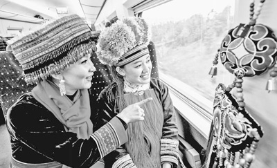 28日,身著民族服裝的姑娘在體驗滬昆高鐵。
