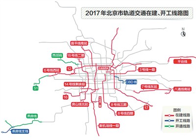 數據顯示,2017年,北京市在建軌道線將超過350公里,線路之多、建設規模之巨再創歷史紀錄。今年在建的20條線路分別是16號線、16號線二期西苑至蘇州街段、S1線、西郊線、燕房線、新機場線一期、12號線、17號線、19號線一期、6號線西延、7號線東延、8號線三期、8號線四期、3號線一期、14號線剩余段、房山線北延、機場線西延、平谷線、八通線南延和昌平線南延一期。