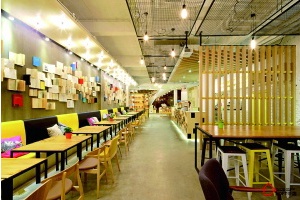 言幾又,看名字就知道,“言幾又”,合起來就是設(shè)計的“設(shè)”,這里玩兒的就是設(shè)計。不僅賣咖啡、簡餐,還賣書和創(chuàng)意商品。其實嚴(yán)格來說,這里并不是一家餐廳,而是一家創(chuàng)意書店。就餐區(qū)內(nèi)一個一條十多米長的“書墻”,也是這里的主要特色,讓文藝青年們在就餐的同時也能感受到富有鮮活生活方式的文學(xué)氣息。餐區(qū)內(nèi)通過使用簡單的材料組合,如木頭、磚頭以及混凝土地板平臺營造出令人放松的環(huán)境氛圍,傳遞出一種現(xiàn)代的簡潔新潮風(fēng)格。