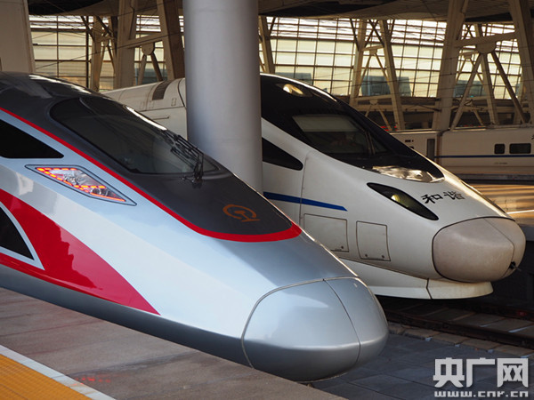 9月21日,“復興號”動車組和“和諧號”動車組在北京南站等待旅客乘車。(央廣網記者何微攝)