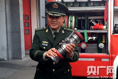 海淀消防支隊雙榆樹中隊指導員戴亞強介紹消防設備 央廣網記者高藝寧攝
