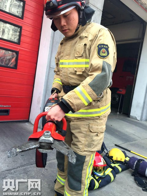 海淀消防支隊雙榆樹中隊副中隊長李澤宇演示消防破拆工具 央廣網記者高藝寧攝