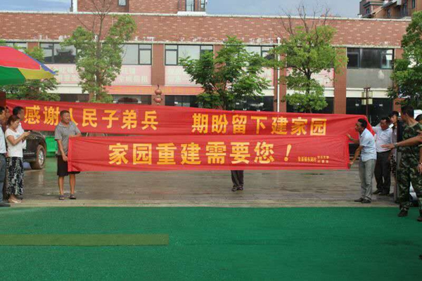 8月9日下午17時40分,在武警水電二支隊安徽東至縣搶險臨時營區(qū)門口,十幾名當(dāng)?shù)厥転?zāi)群眾拉起了“感謝人民子弟兵,期盼留下建家園”“家園重建需要您”等橫幅,送來了“情系張溪人民,盡顯鐵軍風(fēng)采”“危難關(guān)頭伸援手,大愛無疆戰(zhàn)洪魔”兩面錦旗,到部隊“請愿”,請求官兵們留下來,繼續(xù)幫助當(dāng)?shù)馗愫脼?zāi)后重建。
