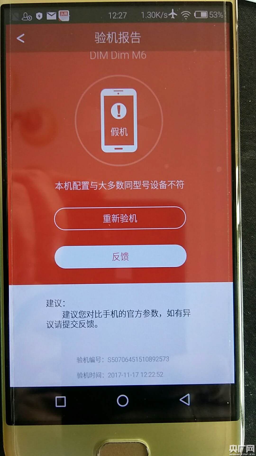 17日,李先生向央廣網記者展示了通過評測軟件測試這款手機的驗機報告截圖,圖片中清晰寫有“檢驗報告:假機,本機配置與大多數同型號設備不符。”