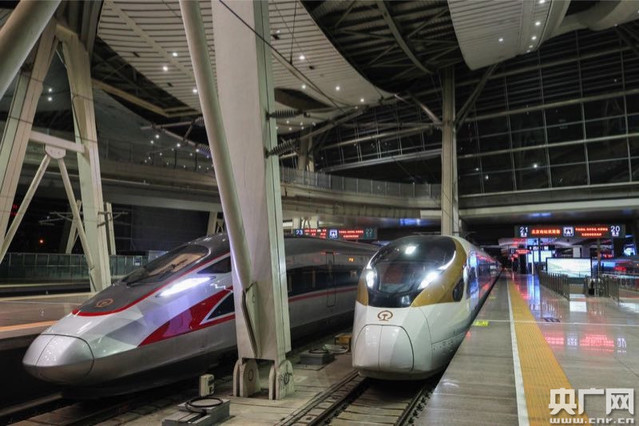 兩輛“復(fù)興號(hào)”列車停靠在北京南站蓄勢(shì)待發(fā)(央廣網(wǎng)記者 王永康 攝)