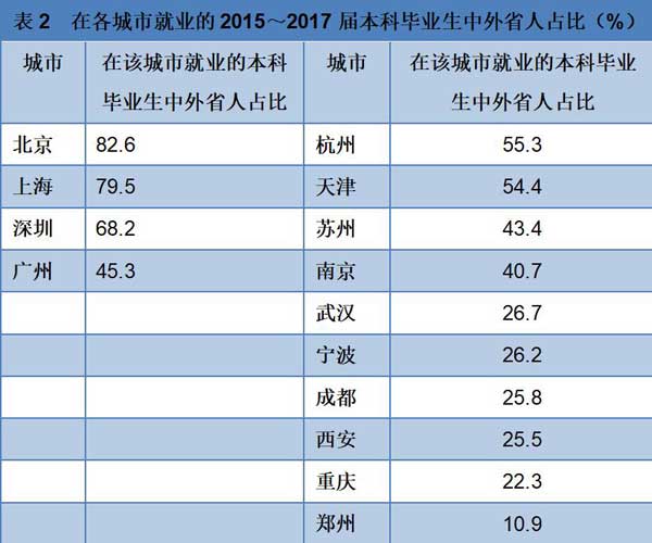 其中,在杭州就業的近三屆本科畢業生中外省人占比最高,為55.3%,其后為天津(54.4%),已高于廣州的該比例(45.3%)。