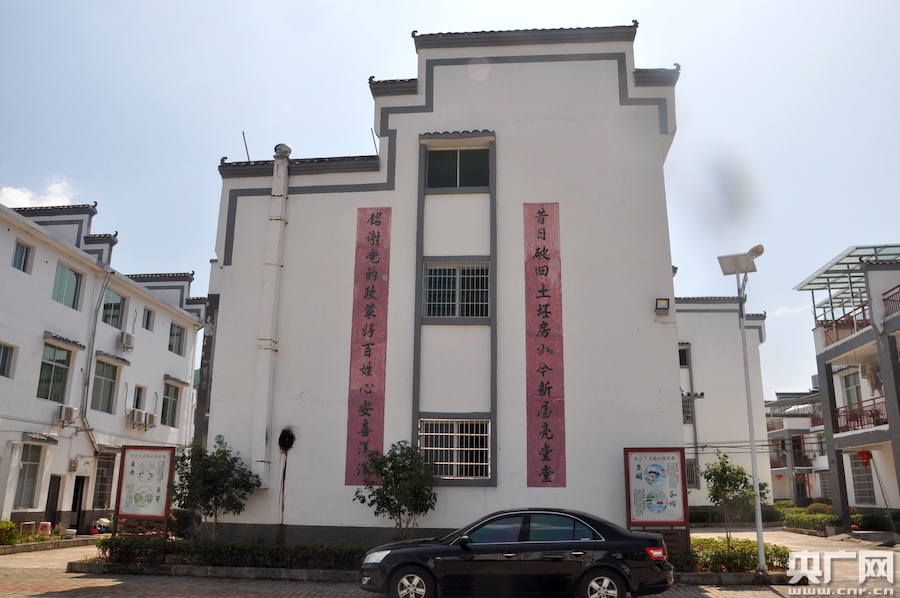 一棟華屋村民居住的三層小樓外,印刷著“昔日破舊土坯房如今新屋亮堂堂,銘謝黨的政策好百姓心中喜洋洋”的字樣(央廣網記者 王子衿 攝)