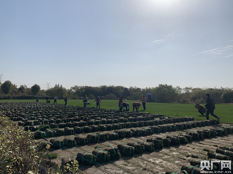村民正在對草皮進行捆扎(央廣網記者 孫冰潔 攝)