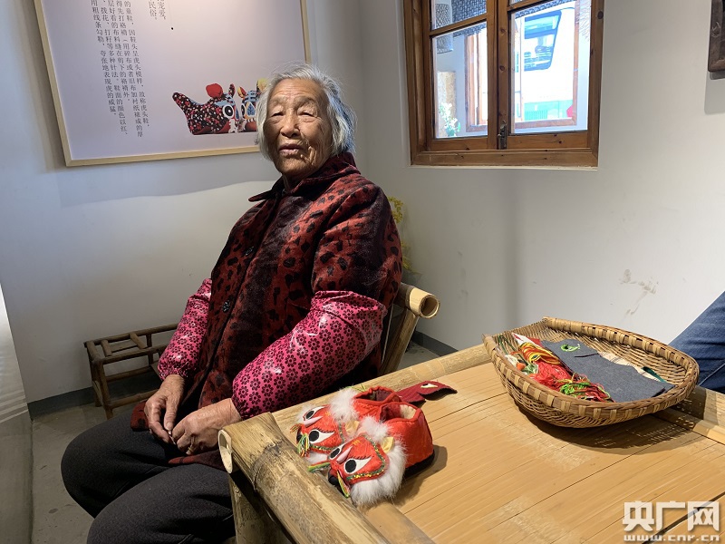 村民丁奶奶與其手工縫制的虎頭鞋(央廣網記者 孫冰潔 攝)