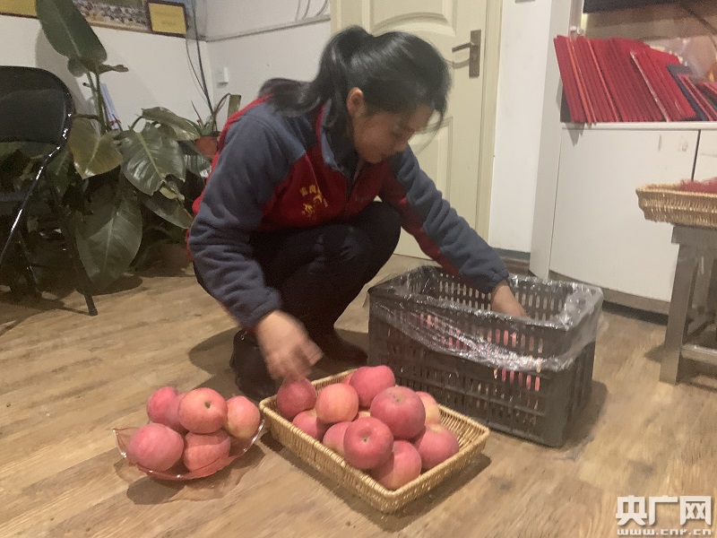 1月20日,牛慶花正在自家倉庫中打包要發貨的蘋果(央廣網記者孫冰潔 攝)