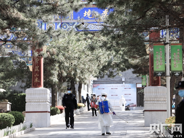 工作人員正在對路面進行消毒(央廣網記者 黃一博 攝)