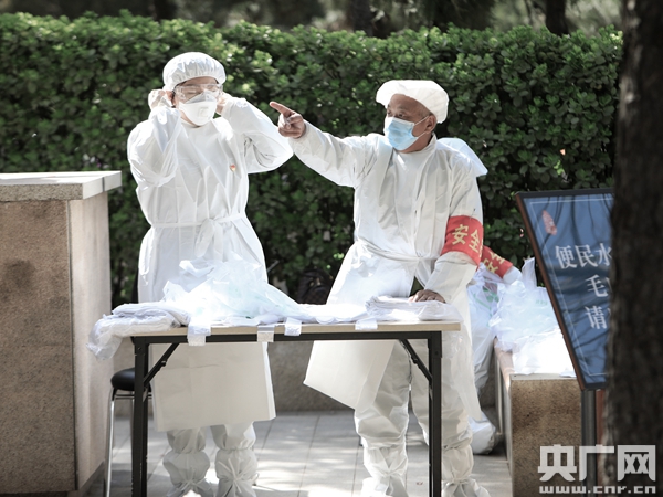 工作人員身著防護服,為前來祭掃的人們提供免費便民水袋和毛巾(央廣網記者 黃一博 攝)