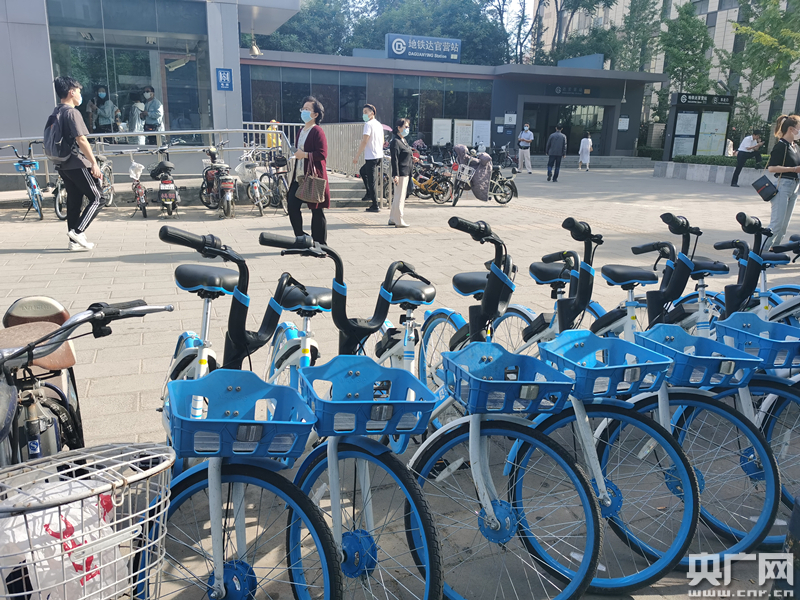 北京地鐵7號線達官營站前擺放整齊的共享單車(央廣網記者 劉一荻 攝)