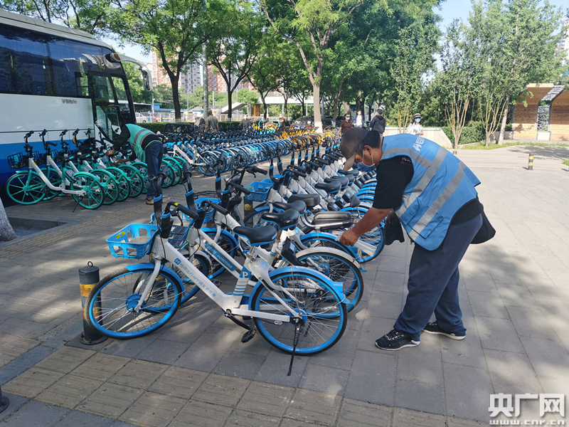 工作人員正在給共享單車進行重點局部消毒(央廣網記者 劉一荻 攝)