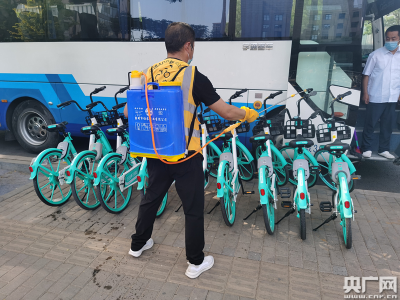 工作人員正在給共享單車噴灑消毒液(央廣網記者 劉一荻 攝)