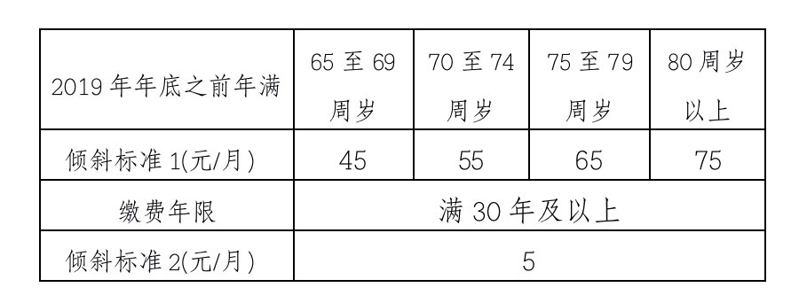 同時(shí),針對(duì)退休時(shí)間早、年齡偏大的退休人員,為了進(jìn)一步提高他們的基本生活水平,自2007年起,北京市在調(diào)整企業(yè)退休人員基本養(yǎng)老金時(shí)均向高齡退休人員適度傾斜。2016年首次同步調(diào)整企業(yè)和機(jī)關(guān)事業(yè)單位退休人員養(yǎng)老金時(shí),保持了這一做法。2020年繼續(xù)堅(jiān)持這一做法,對(duì)在2019年12月31日(含)之前已經(jīng)年滿65周歲及以上的高齡退休人員,在按照上述辦法進(jìn)行調(diào)整后,再次享受到45元至75元四個(gè)檔次的傾斜政策。即:65至69周歲的退休人員每人每月再增加45元;70至74周歲每人每月再增加55元;75至79周歲每人每月再增加65元;80周歲以上每人每月再增加75元。