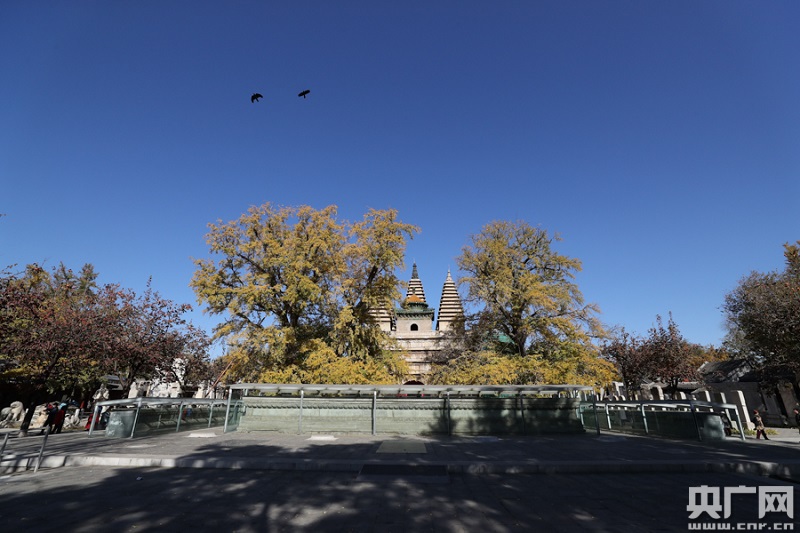 11月3日,五塔寺,園內的兩顆古銀杏樹在藍天的映襯下格外顯眼(央廣網記者 韓靖 攝)