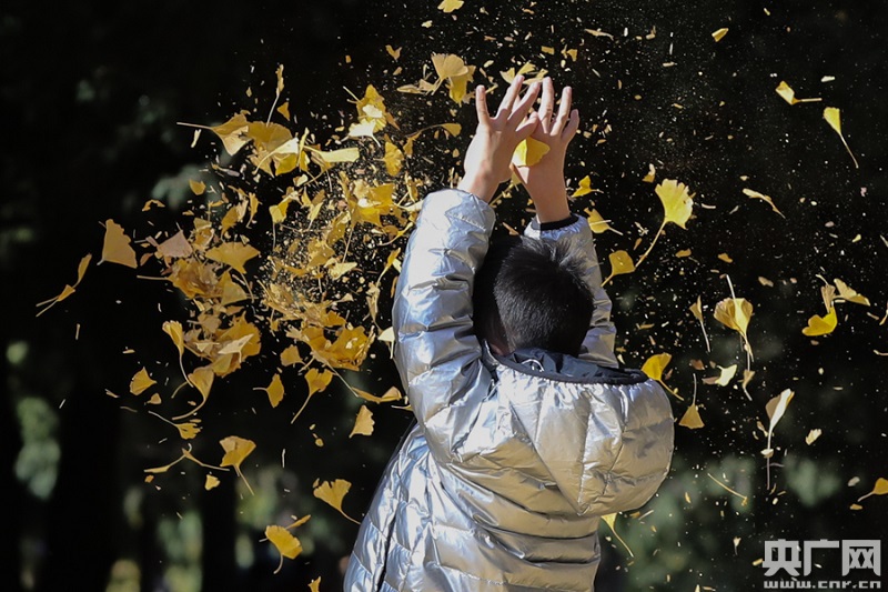 11月3日,地壇公園,一個小男孩在銀杏樹下玩耍(央廣網記者 韓靖 攝)