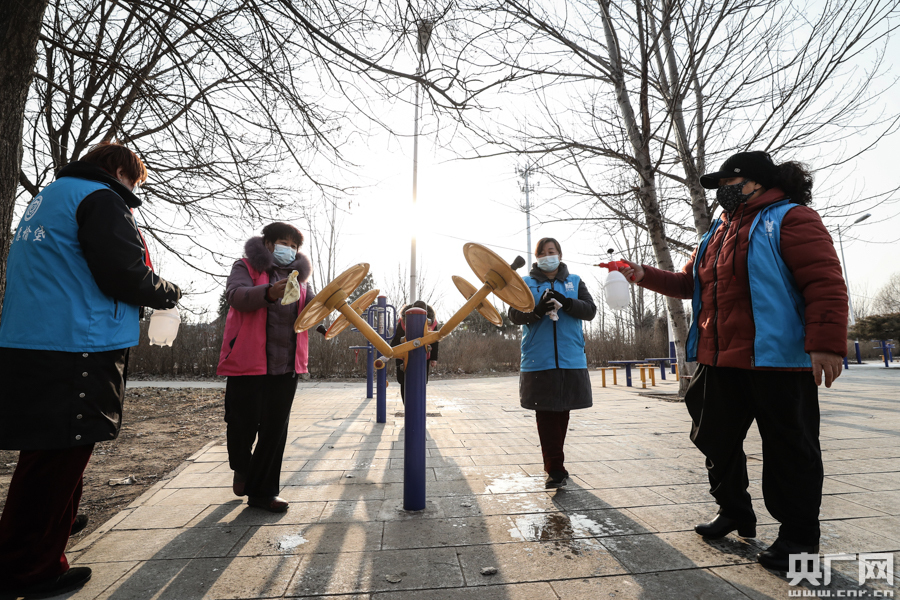 隊員們正在為健身器材消毒(央廣網記者 韓靖 攝)
