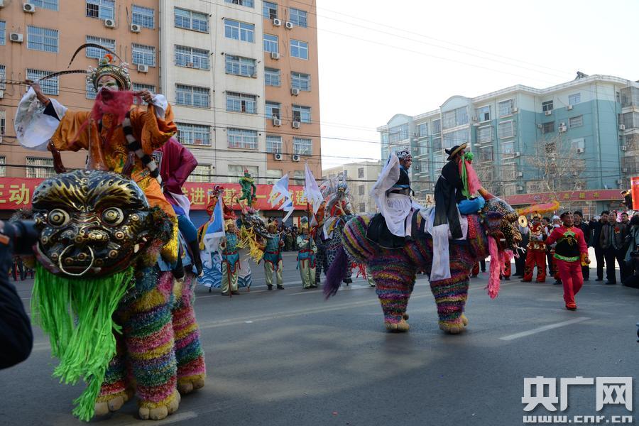 山西稷山:紅火鬧“春”社火表演 央廣網稷山2月14日消息(記者賀威通 通訊員楊明有)高臺花鼓敲起來,高蹺走獸抖起來,歡快秧歌扭起來,廣場舞蹈跳起來,社火鬧新春,稷山嗨起來…… 近日,后稷故里、紅棗之鄉山西稷山縣人頭攢動,熱鬧非凡。2017年“文明之春”大型社火表演活動隆重舉行,為當地和來自晉陜豫黃河三角洲許多縣市的百姓獻上了一場豐盛的社火表演,讓群眾體驗到民間文化藝術的魅力,度過了一個歡樂祥和的新春元宵佳節。 稷山,是中國農耕始祖后稷培植五谷、教民稼穡的地方。在當地,像我國北方地區一樣,正月十五元宵佳節,群眾有元宵鬧社火的傳統習俗。稷山社火表演,以當地文獻史料、文化歷史淵源、傳統民間傳說和戲劇故事為題材,通過一個或一組人物展現一個故事,一個故事即為一轉社火。 當日,艷陽高照,春寒料峭,稷峰街上氣氛熱烈,到處洋溢著歡聲笑語。上午10點,社火表演在氣勢宏大、整齊劃一的百人旗隊中拉開序幕。稷山縣社火表演,來自當地縣直機關單位和稷峰鎮各鄉村的64支社火代表隊選派節目,參加了元宵社火表演活動。伴隨著歡快的音樂節奏,演員們精神飽滿,神采飛揚。 舞龍、舞獅、抬閣、秧歌、高臺花鼓、高蹺走獸、馬拉鼓車等,具有濃郁地方特色的表演節目,盡現觀眾眼前。從站前路出發至振興路,約2公里長的隊伍,見首不見尾。 據了解,稷山民間社火,是春節期間傳統民間的自演自娛活動。它來源于古老的土地與火的崇拜。跑旱船,跑竹馬,編隊穿梭奔馳、跳躍、對唱,樂感強烈,節奏鮮明,氣氛熱烈。稷山抬閣,縣境內汾南汾北精心設計制作的抬閣,大多是集歷史故事、神話傳奇于一體,融繪畫、戲曲、彩扎、紙塑、雜技等藝術為一身的特色傳統民俗舞蹈,已經有數千年的歷史。如牛郎織女、武圣關公、關公與貂蟬等等。 地處汾水河槽地帶的稷峰鎮,這次參加縣里社火表演的抬閣,有的是一個演員伸出手臂,上面站立著另一個演員;有的是荷花高空盛開,一個小孩站在荷花上面左右旋轉;有的是一個演員兩臂伸開,一手抓著一個小孩的辮子,小孩懸在空中一動不動,高處的演員漫舒廣袖,輕輕擺動身體,下面抬拉的人穩步向前。有著悠久歷史淵源的稷王威風鑼鼓,民間鼓樂中是枝奇葩,光彩奪目,是古老的民間藝術形式。以節奏強烈明快、場面壯闊粗獷為特點,充分展示了稷王山下汾河兩岸群眾質樸豪放的氣質。稷王威風鑼鼓,老百姓俗稱 "家伙",是集鑼、鼓、鐃、釵四種樂器合奏表演的一種傳統打擊鼓樂,并融音樂、舞蹈、技藝于一體,是稷山民間鼓樂的突出代表。 稷山花鼓,敲敲打打、扭扭唱唱。著男式表演服裝的演員為核心人物,在舞臺或村組中心地帶抱鼓表演,另有四個或八個著女裝的花鼓女圍著他表演,扭秧歌;ü臉逢犜谂赃叞樽啵颐恳粋段落間還配有花鼓曲演唱。現在,抱鼓的由單人變為雙人雙打,扭秧歌的花鼓人女由四人增至八人、十人。稷山花鼓在境域內汾南、汾北各有不同,其中以汾南東蒲的花鼓和汾北桐上的花鼓最為著名。