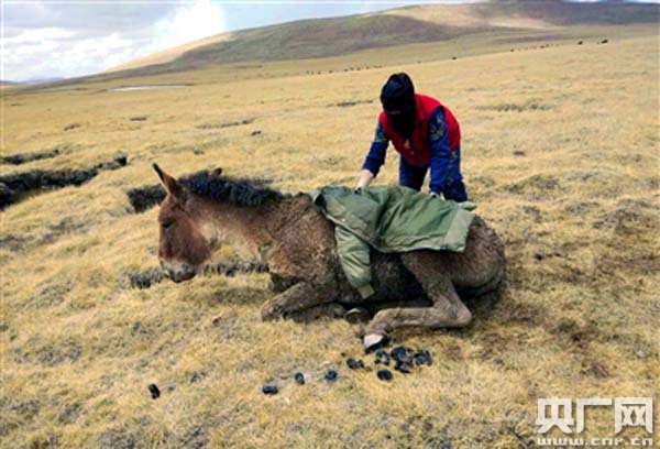 由于藏野驢在坑內卡得時間過長,下半身已僵硬,動彈不得。管護隊員們脫下大衣披在了藏野驢身上,等待它恢復體力。