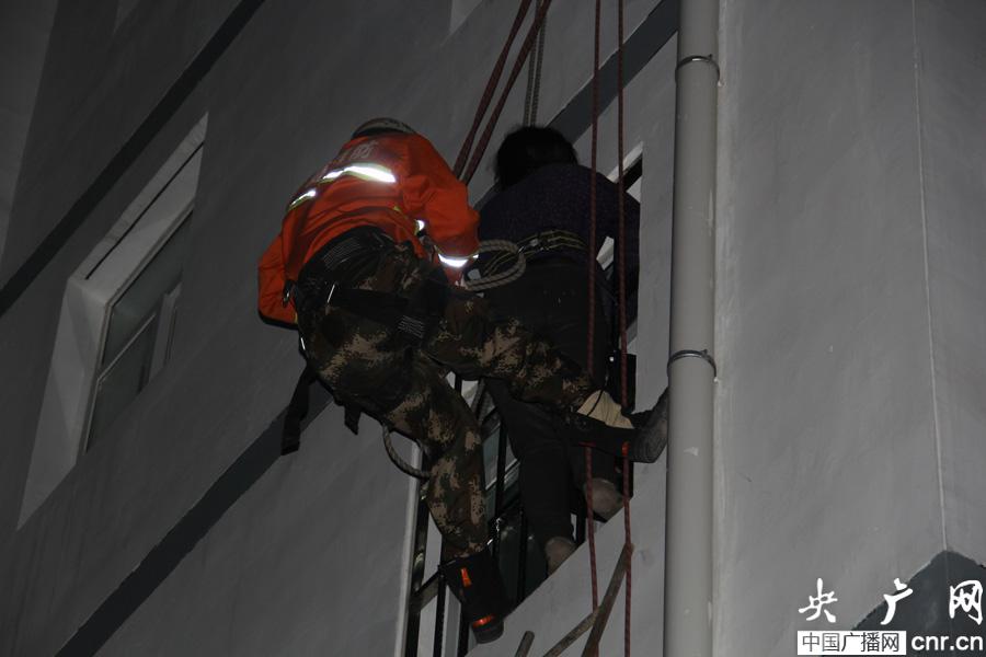 當地消防人員5分鐘趕到,立即救援,從樓上鋪設安全繩,救援人員小心靠近輕生婦女,順利地將安全繩系在了她的腰間。十分鐘后成功將她安全救護到一樓。這名輕生婦女幸運脫險,只有手臂受輕傷。