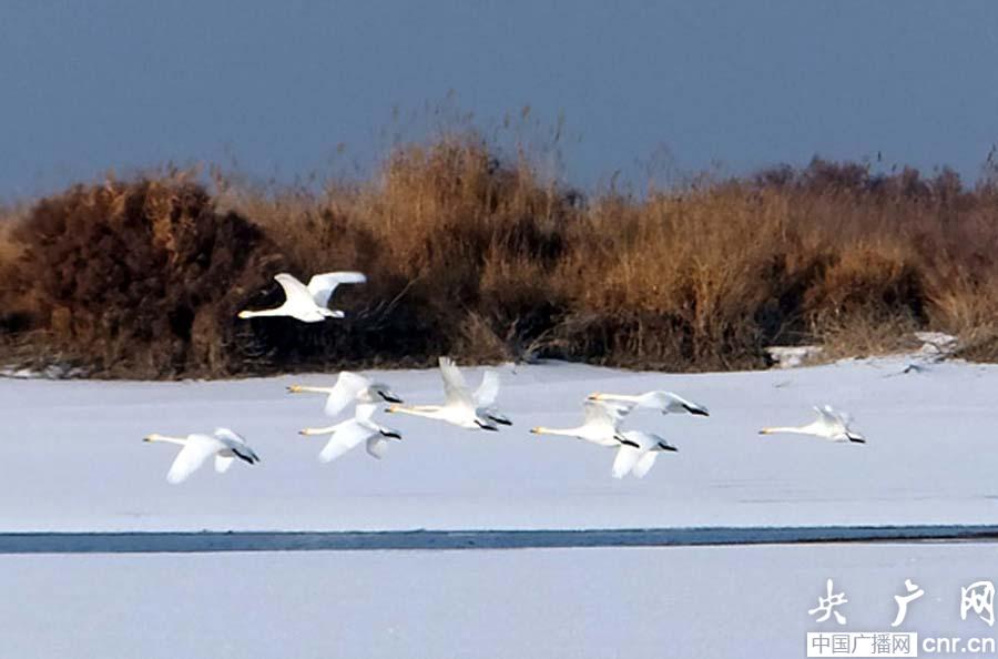 央廣網尉犁1月3日消息(記者張雷 通訊員劉濤 陳天王)新疆巴音郭楞蒙古自治州尉犁縣塔里木二庫濕地生態治理區內今年停留越冬的天鵝、野鴨等候鳥數量創下2008年以來新高,目前有天鵝200余只、野鴨500余只。