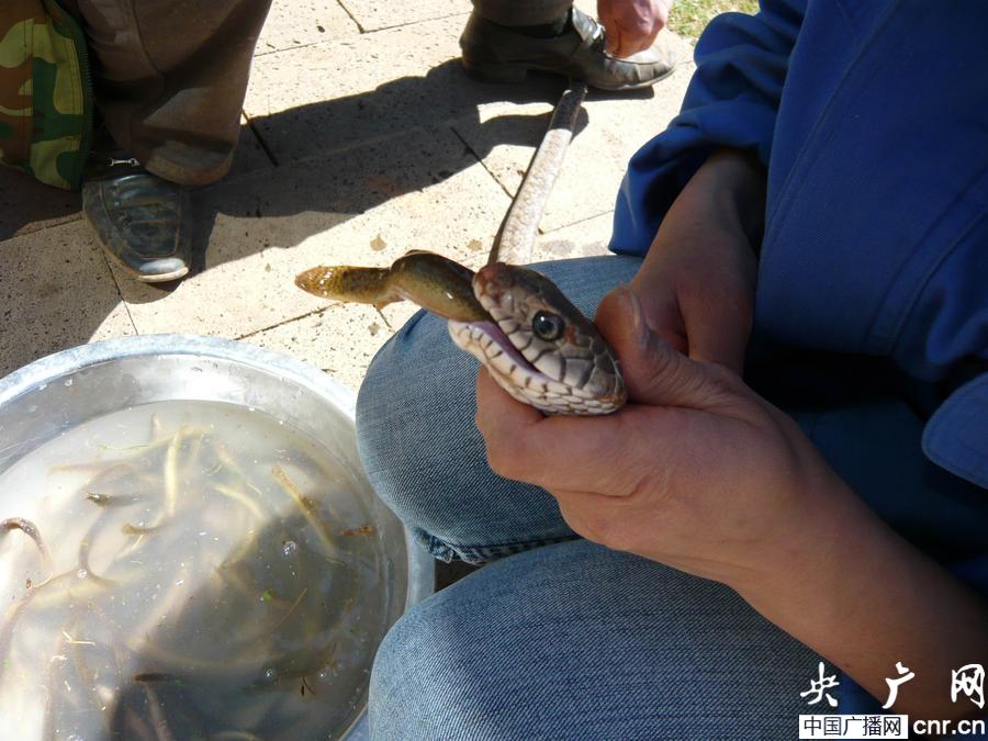 中午11時,工作人員把蛇一條條從蛇園里拿出來,一只手捏著蛇的頭,強迫蛇張開嘴巴,另一只手從旁邊的盆里取出一條活生生的泥鰍來,往蛇的嘴里塞。可能是很久沒有進食,蛇對送進嘴里的食物沒有主動進食的反應(yīng),有的甚至把食物吐出來。幾名工作人員同時填食,經(jīng)過一個多小時,每條蛇填進了3條泥鰍,100條蛇終于吃完蘇醒后的第一餐。據(jù)了解,這次喂食的蛇均為無毒蛇。