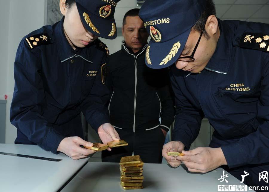 霍爾果斯海關關員查獲涉嫌走私黃金7.75公斤(央廣網發 李愷攝)