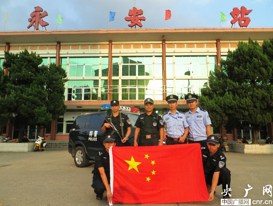 圖為永安車站派出所民警與國旗合影(央廣網記者 葛朝興 攝)