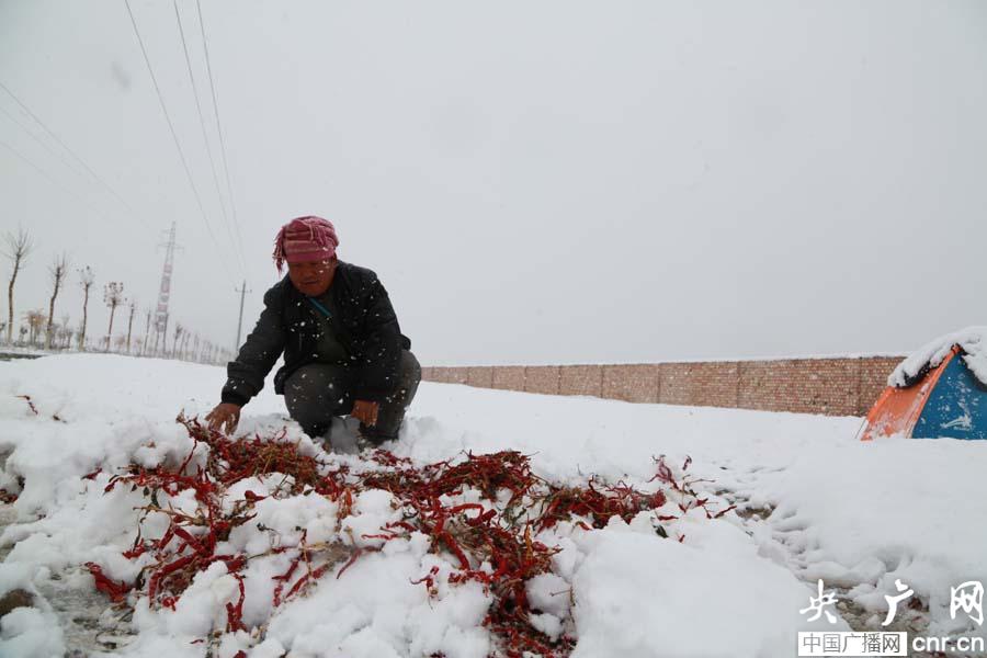 暴雪覆蓋正在晾曬的辣椒(央廣網記者 吳卓勝 攝)