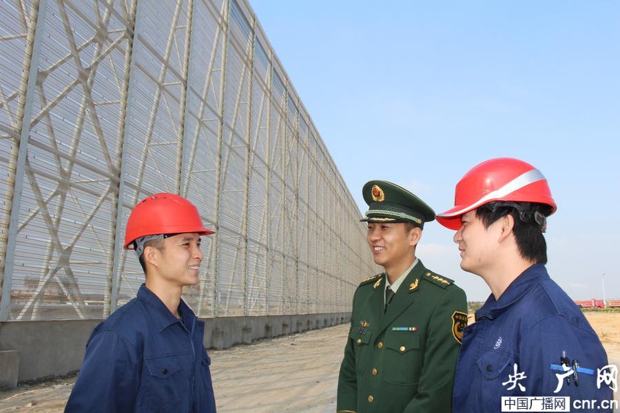 拼經濟更重環保。11月28日,在福建省莆田市東吳港區高達18米藍色防風網前,負責碼頭監護的莆田邊防檢查站正向工人宣傳環保理念。據邊檢警官卓志偉介紹,東吳港區東總投資超過22億多元,年吞吐量逾1000萬噸,目前在煤炭堆場豎立起防風網全長1641.67米,總造價3100多萬元,對風力進行有效控制,最大限度地衰減來風的動能,從而達到抑制揚塵的“最后一公里”防護效果。