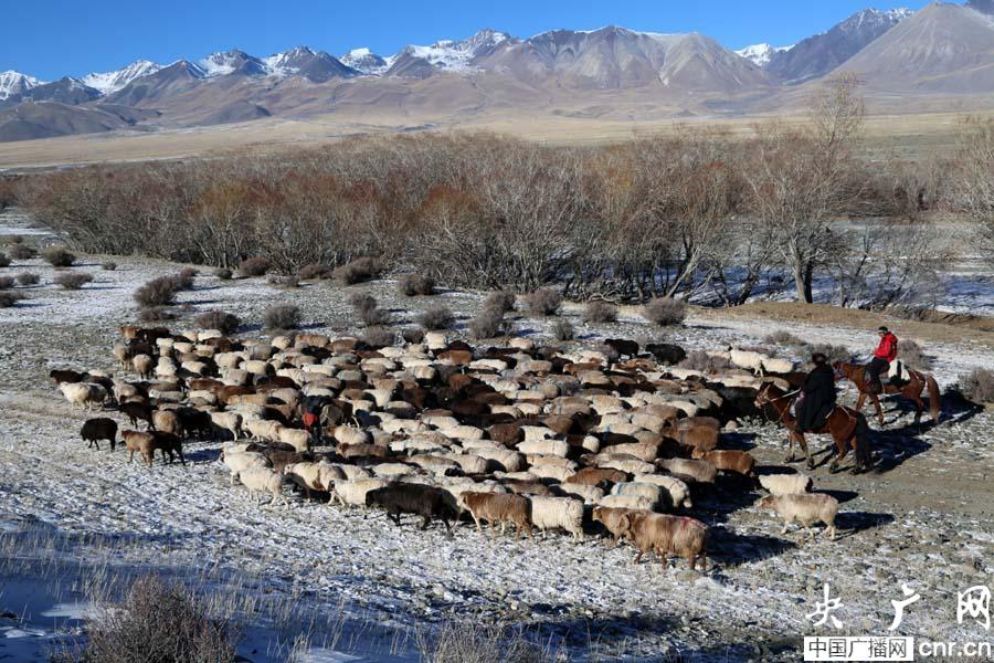 巴哈趕著羊群走出雪山(央廣網記者 張雷 攝)