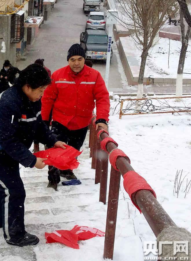 克拉瑪伊白堿灘物業(yè)管理公司員工冒著雪花清理階梯冰雪(周建玲攝)